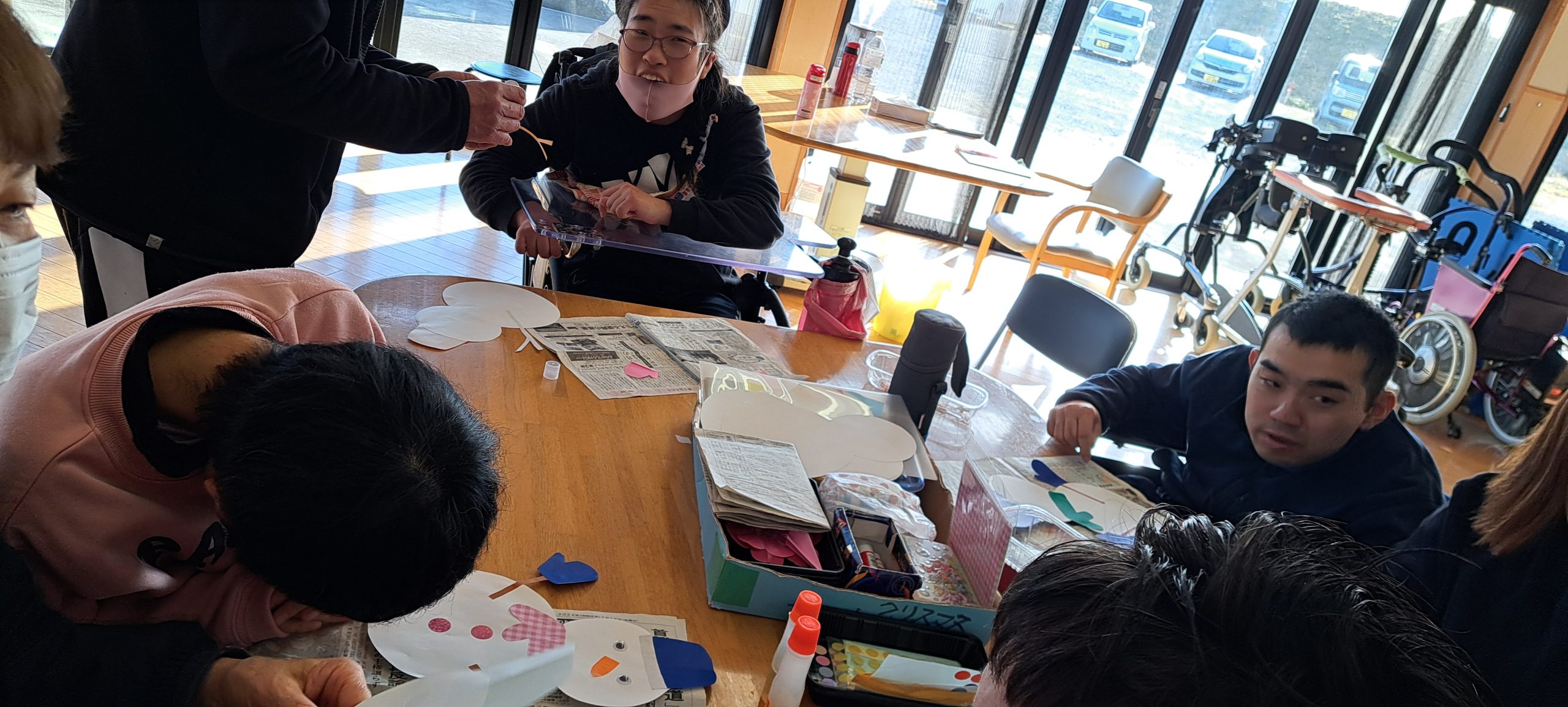壁面装飾の創作活動、体を動かしながらのレクリェーション・理学療法士の助言を受けながらの運動等、その方の希望やニーズを実現できるよう日々の活動に取り組んでおります。年間行事として、季節を感じられるイベントも企画しています♪日常動作において必要な支援を受けながらも、できることの広がりや楽しみのある生活につながるよう、その方の“得意”や“好き”に焦点をあてながら利用者様主体のサービス提供を行っております。